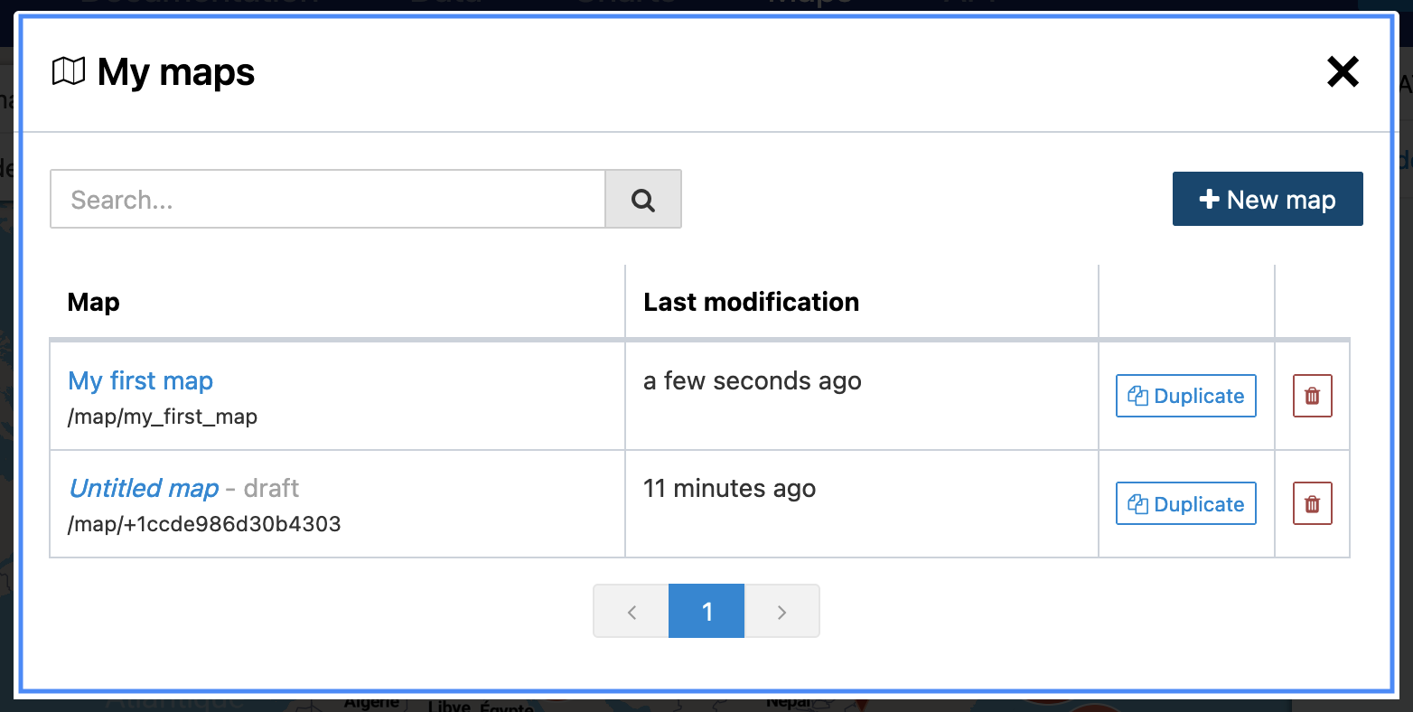 Everything you do to manage your maps except saving and renaming (see Rename and save a map) are made from the My maps interface. This menu is accessible from the menu displayed at the very top of the map.