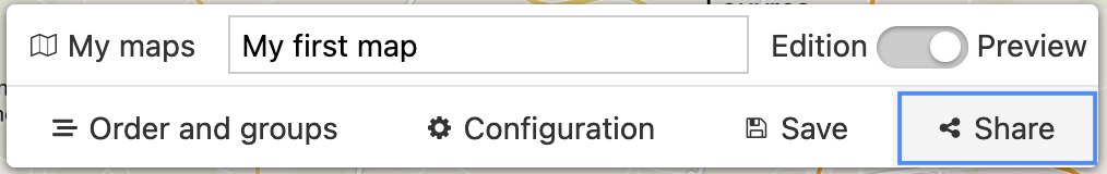 In the Maps interface, you can share your map in different ways, all available through the Share interface. This interface is accessible from the Maps menu displayed at the very top of the map.