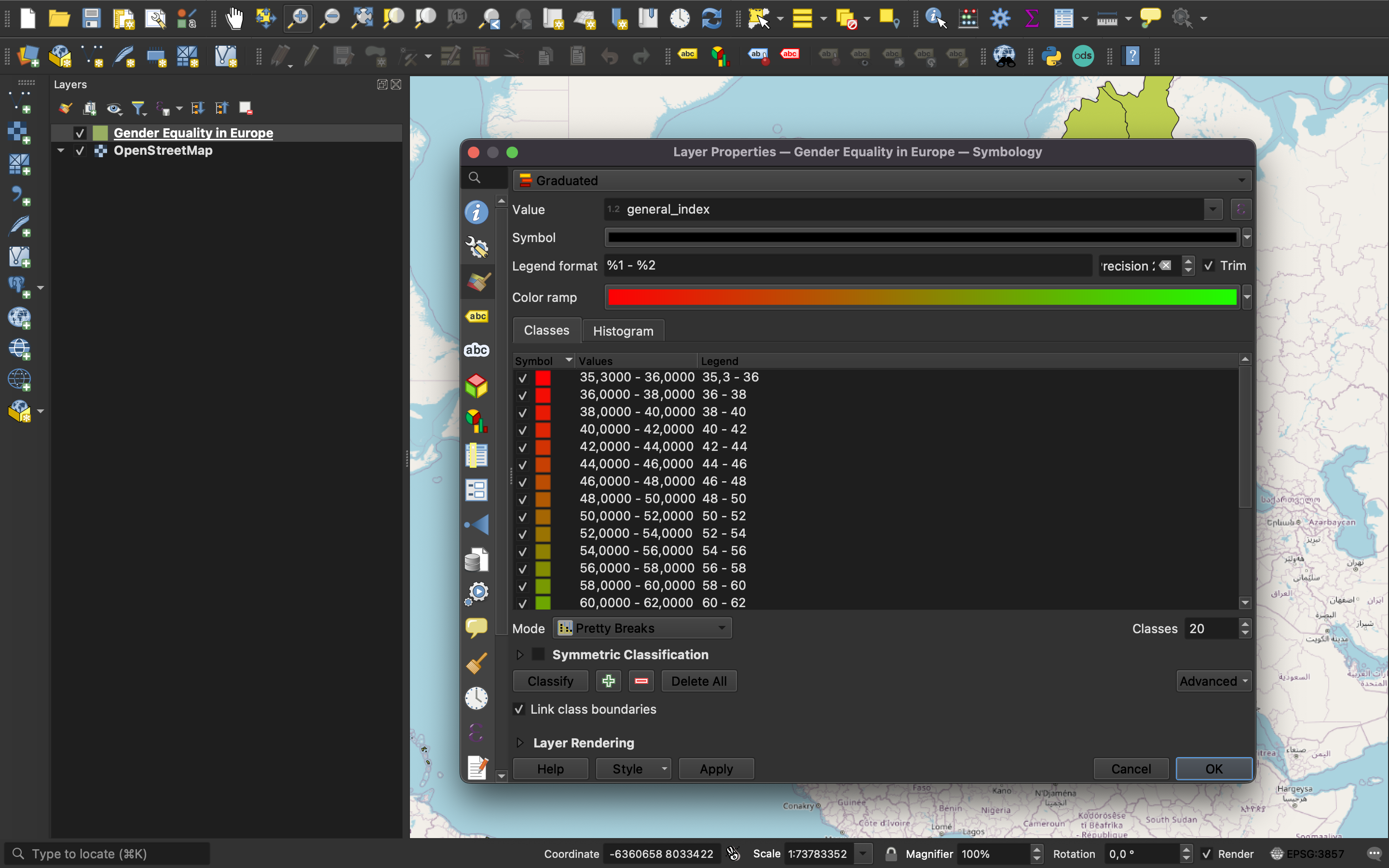 Here, we have specified to the software the significant column general_index for the gradient, which represents the average rating given to a country. Thus, we have a better representation of gender inequalities in Europe compared to a tabular view.