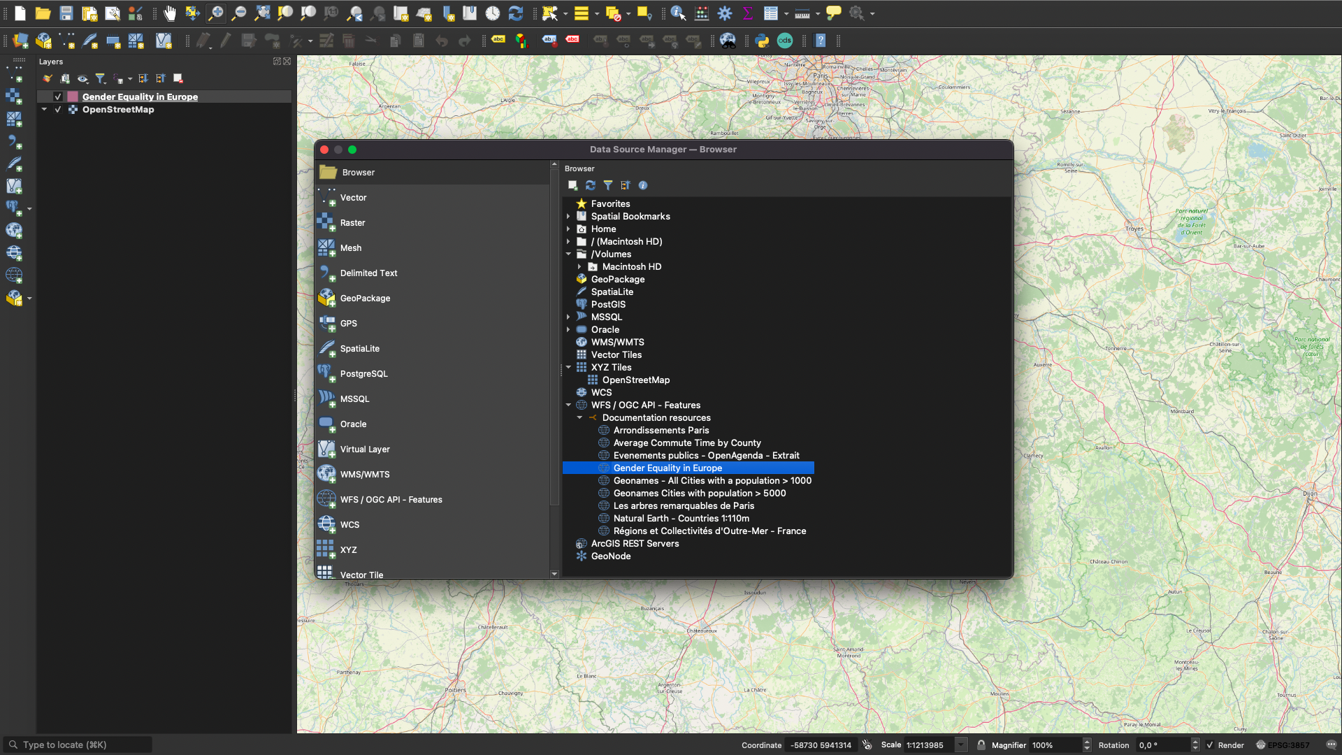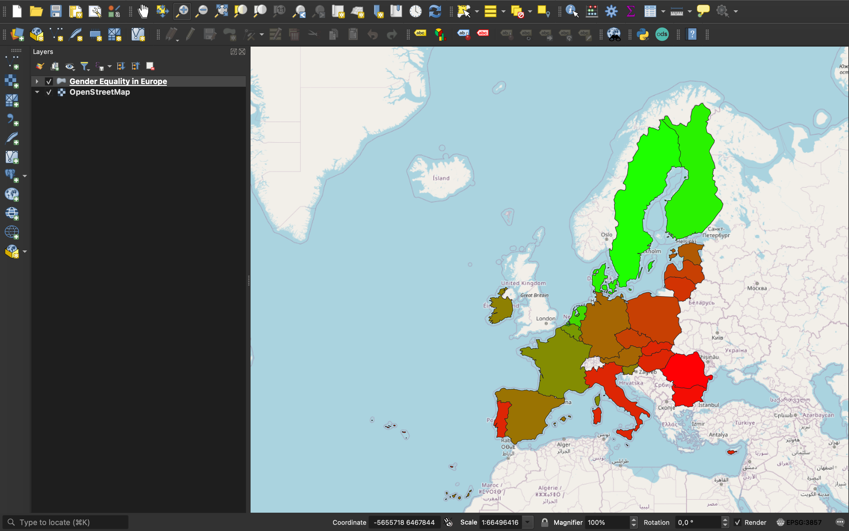 The examples on this page are based on a dataset of European countries and their ratings for gender equality. And to visualize the data, we'll use QGIS, a popular application for viewing, displaying, and analyzing geospatial data.