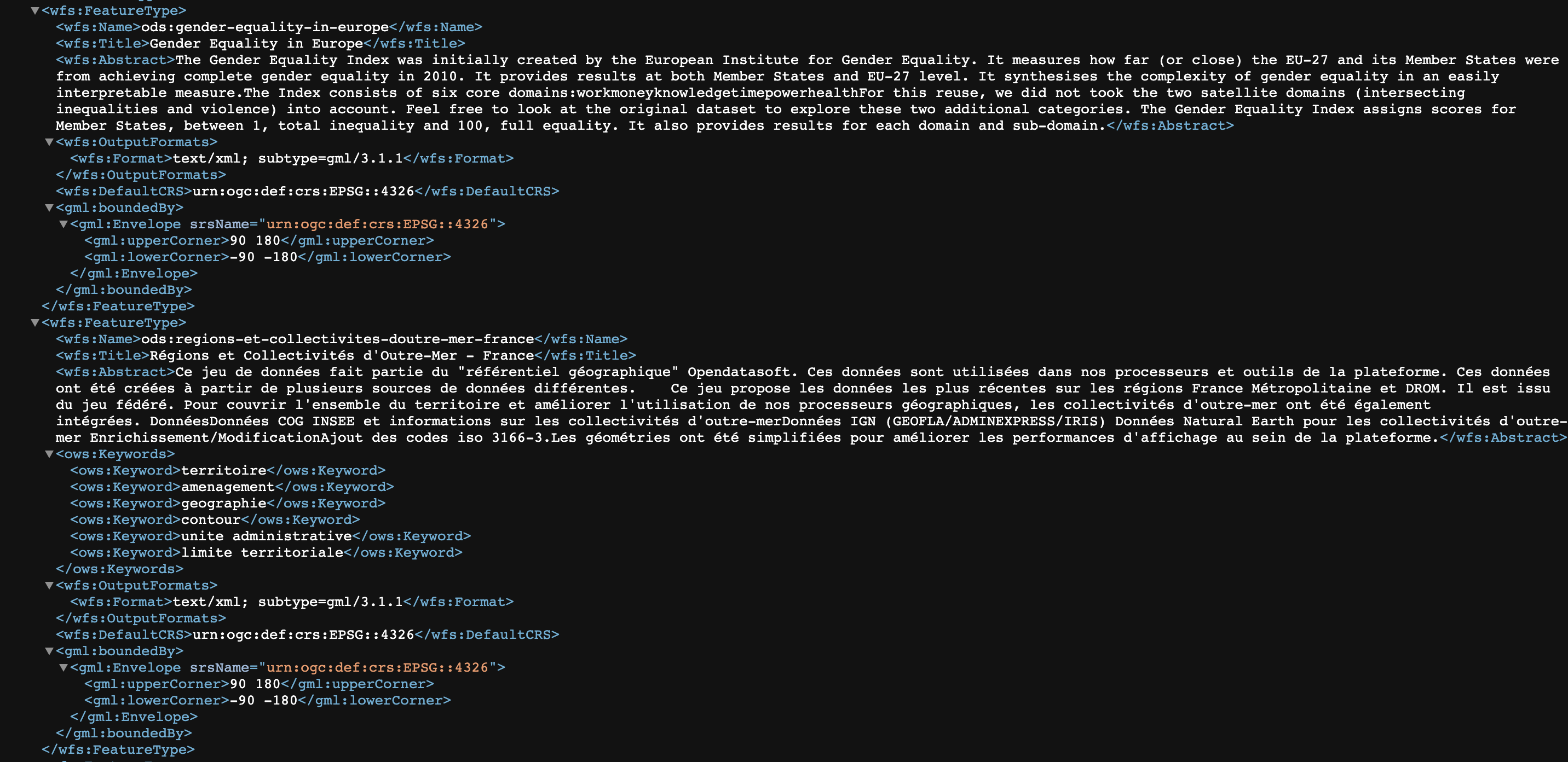 In WFS, the "typename" is a dataset's identifier. In the example from GetCapabilities above, one of the datasets in the "documentation-resources" workspace had the typename: "ods:gender-equality-in-europe." We'll use it in the example below.