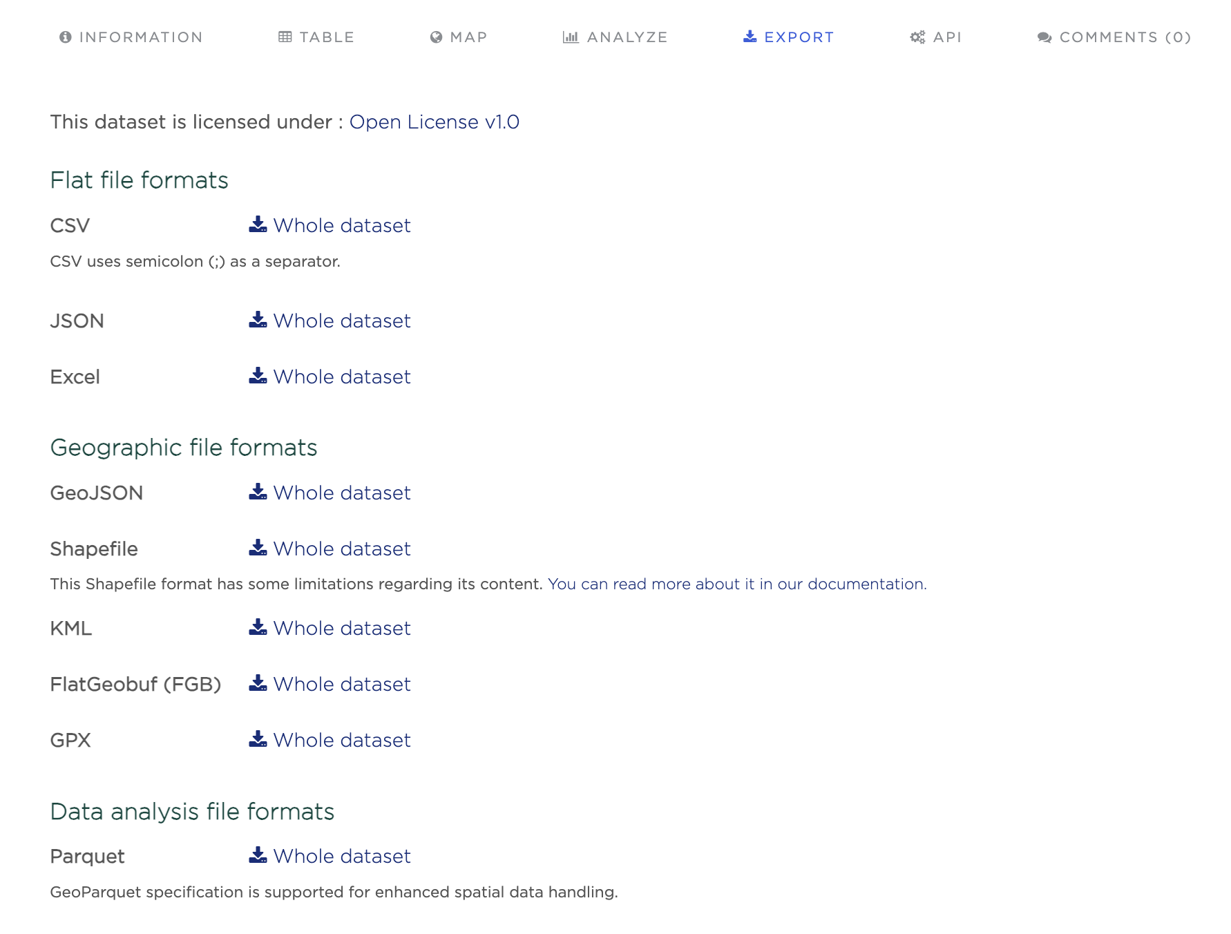 Datasets can be downloaded in various formats. While flat file formats (CSV, JSON, Excel) are always available for any dataset, other formats may be available, depending on whether the dataset contains geographical coordinates or not.