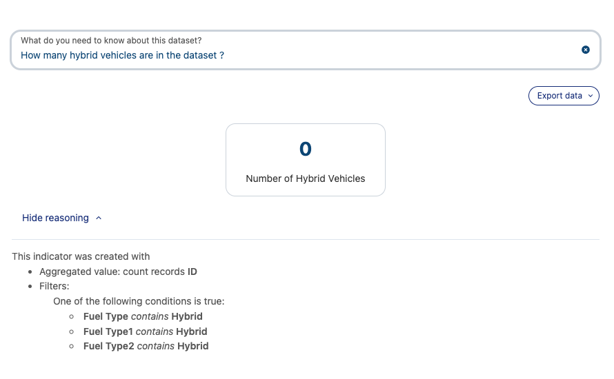 As you can see below, though in fact there are hybrids in the dataset, the bot has returned 0. When we examine its reasoning, we can see why. Though upon examination the "Fuel Type" column is indeed where the answer is located, the bot apparently was looking for the value "Hybrid" when in fact the relevant value is "Electricity."