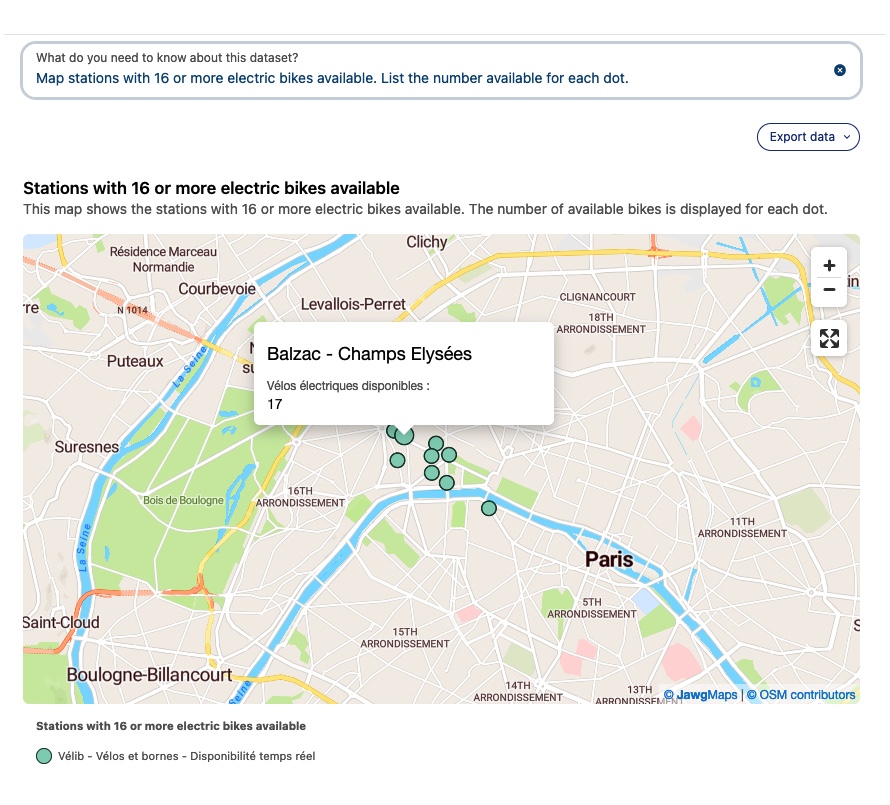 Note that maps can show only one kind of data point at a time. However, you can request that each data point include specific information from the dataset. For example, if you wanted to map the parking lots from the tip above, you can't ask that full parking lots be indicated in a different way. However, you can request that the number of remaining spots (assuming that column exists) can be included when you click on any given point in the map.