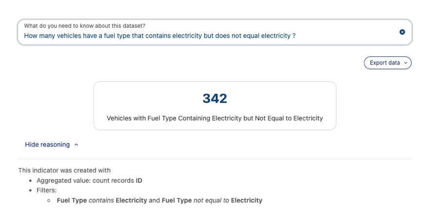 We risk confusing the bot, but we can try to obtain the answer directly by asking something like, "How many vehicles have a fuel type that contains electricity but does not equal electricity?" And here we also get our answer: 342.