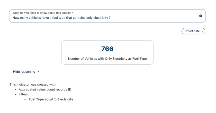 How about only fully-electric vehicles? If we ask, "How many vehicles have a fuel type that contains only electricity?" we get the answer: 766.