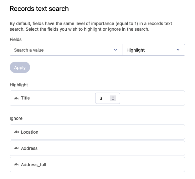 For fields you’ve chosen to highlight, you can adjust the weighting applied in users’ searches. The default value is 1, so any new value will be 2 or higher. Type in the number you wish, or click the up or down arrows.