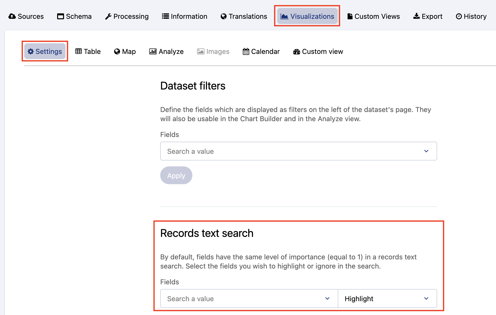 In your dataset, click on the Visualizations tab and look under “Records text search.”