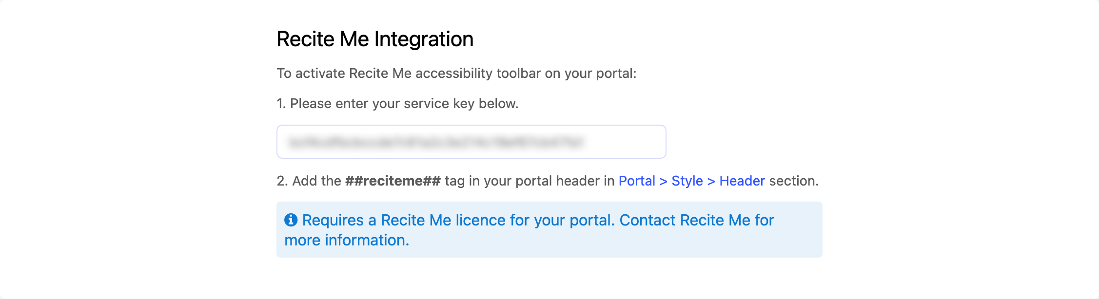 Go to Portal > Visualization settings. There, under "Recite Me integration" enter your Recite Me key where indicated.
