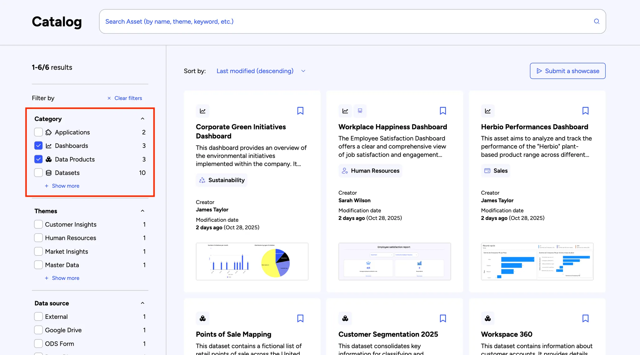 Your data marketplace brings all these assets together in one place, making data easy to find and access. Use filters on the left to narrow your search by asset type. Each asset card shows key information to help you quickly assess its relevance. More details here.