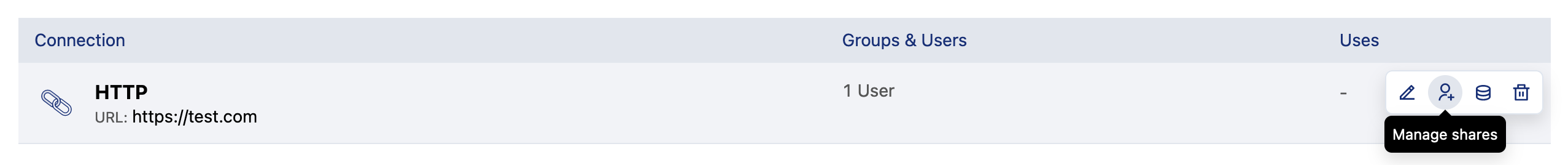 Pour partager une connexion enregistrée, survolez la connexion et cliquez sur l'icône Gérer les partages (la deuxième en partant de la gauche).