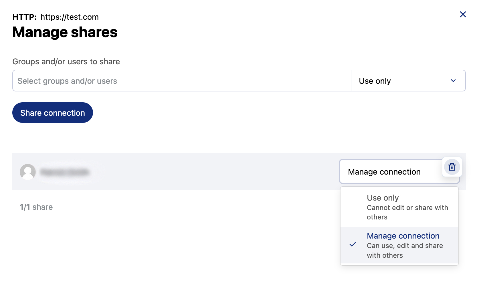 Gérer la connexion : En plus des droits « Utiliser la connexion », ces utilisateurs et groupes peuvent modifier les paramètres de connexion, ainsi que partager l'accès avec d'autres utilisateurs ou groupes.