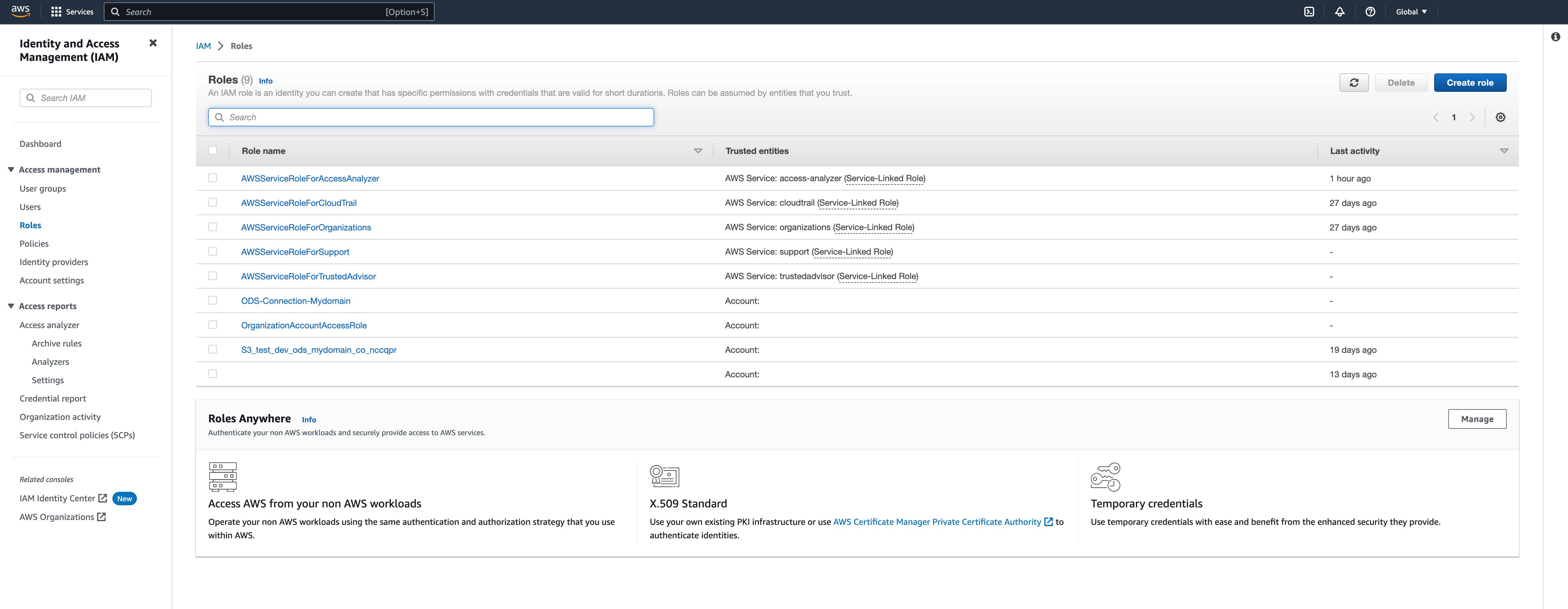 Vous trouverez l'ARN du rôle au centre de l'écran. Il doit contenir votre numéro de compte AWS et le nom de votre rôle (par exemple, arn:aws:iam::061258320951:role/ODSRoleAuthMyDomain