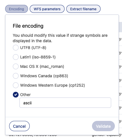 Encodage de fichiers | Encodage du fichier. Le codage des caractères correspond à la manière dont les caractères sont représentés dans un fichier enregistré. Unicode (ou UTF-8) est la norme universelle, mais certains fichiers peuvent être encodés dans un format existant (par exemple, les anciennes versions d'Excel), ce qui nécessiterait de définir l'encodage manuellement. Sur les logiciels modernes, cela est généralement inutile. | Par défaut, la plateforme utilise une heuristique pour deviner l'encodage. Si l'encodage deviné n'est pas correct, sélectionnez le bon encodage à appliquer dans la liste ou saisissez-le dans la zone de texte Autre. Vous pouvez utiliser n'importe quel alias de Python. |