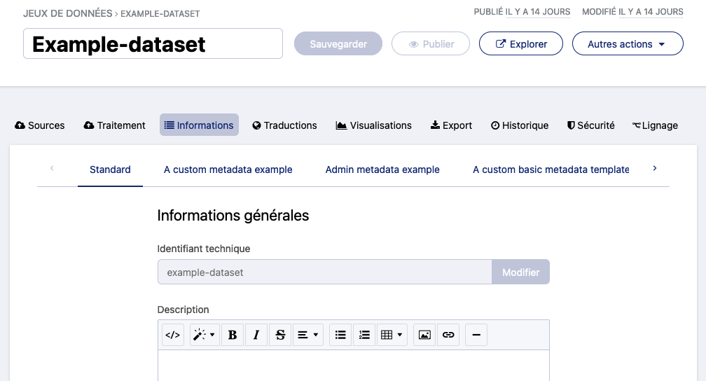 Chaque ensemble de données possède un ensemble de métadonnées par défaut. Mais en règle générale, les métadonnées sont configurées sur la page Modèles de métadonnées, puis renseignées dans chaque ensemble de données.