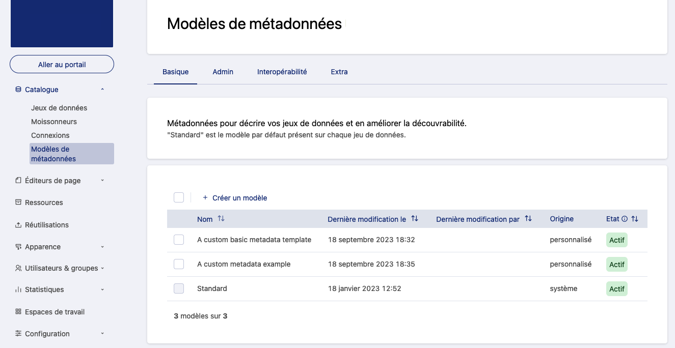 Dans Huwise, toutes les métadonnées sont configurées sur la page Catalogue > Modèles de métadonnées.