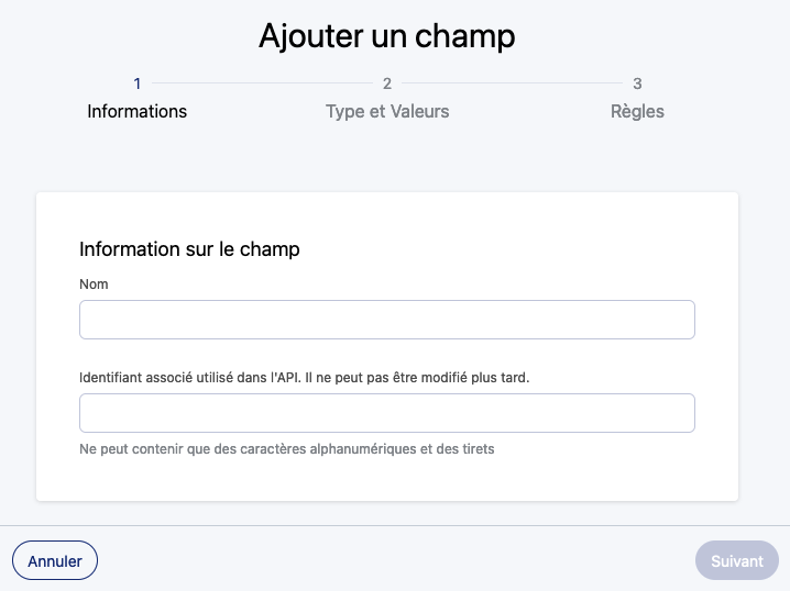 Dans le menu déroulant, précisez le type de champ que vous souhaitez créer, puis cliquez sur Suivant.