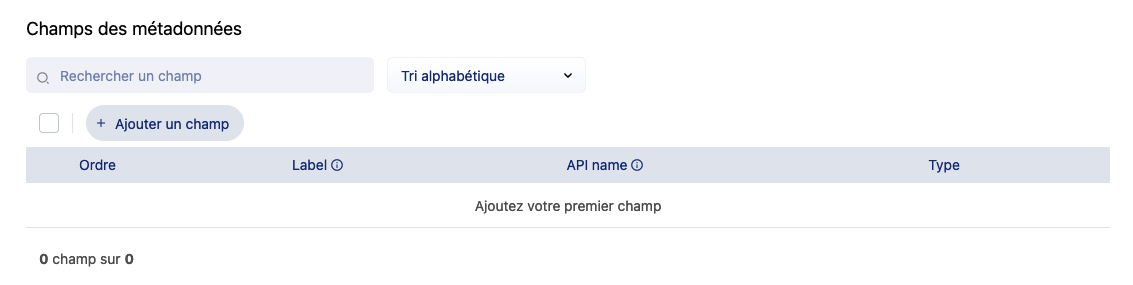 Pour créer un nouveau champ de métadonnées, sous « Champs de métadonnées », cliquez sur + Ajouter un champ.
