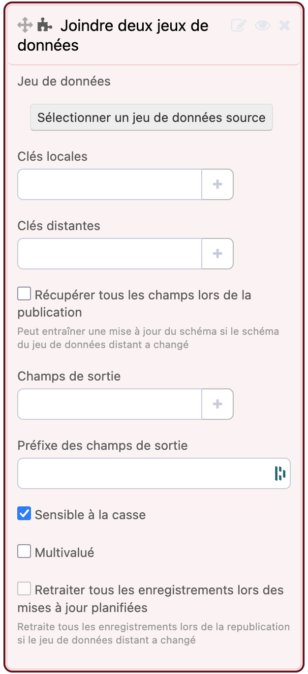 Jeu de données | Jeu de données utilisé pour la jointure. Il peut être sélectionné parmi les jeux de données du portail ou du réseau Huwise. | Oui |
