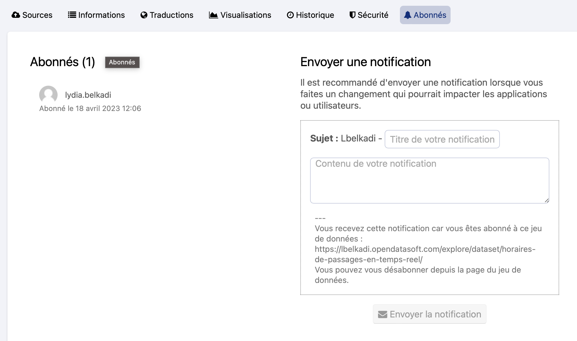 Lorsque vous suivez un jeu de données, côté back office l'éditeur du jeu de données a la possibilité de vous envoyer une notification en cas de changements importants.