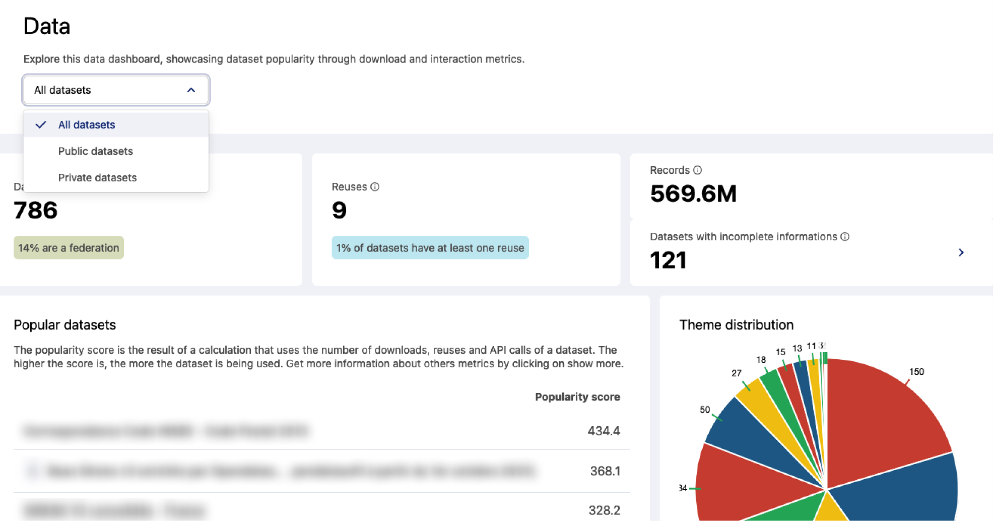 Informations complémentaires si la réutilisation des KPI n'est pas affichée : le pourcentage de jeux de données publiés avec des informations manquantes. Vous pouvez consulter la liste des ensembles de données en cliquant sur le lien.jeu de données populaires : Le score de popularité est le résultat d'un calcul qui utilise le nombre de téléchargements, de réutilisations et d'appels API d'un ensemble de données. Plus le score est élevé, plus l’ensemble de données est utilisé. Vous pouvez trier ces ensembles de données par nombre cumulé de téléchargements, d'appels API ou de réutilisations en cliquant sur Afficher plus.