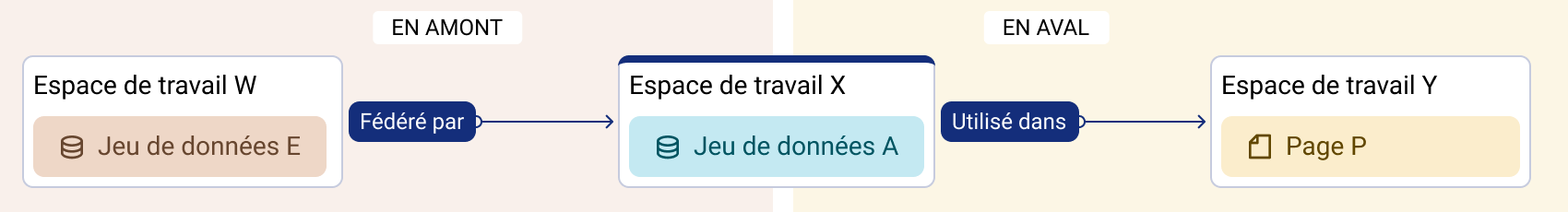 Dans l'exemple ci-dessous, le jeu de données E est en amont du jeu de données A. La page P est en aval du jeu de données A.