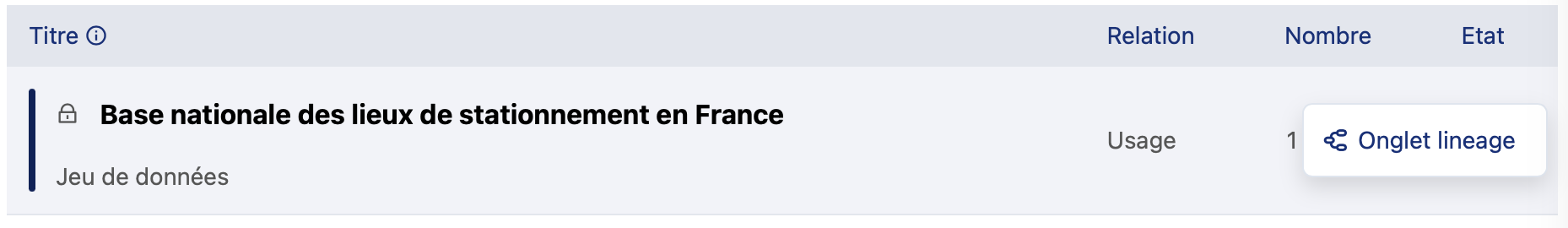 Pour chaque jeu de données publié de votre portail, vous pouvez accéder directement à son onglet de lignage. Survolez le jeu de données et un bouton d'onglet Lignage apparaîtra (voir ci-dessous). Cliquez ici pour en savoir plus sur l'utilisation de la fonction de lignage pour un jeu de données individuel.