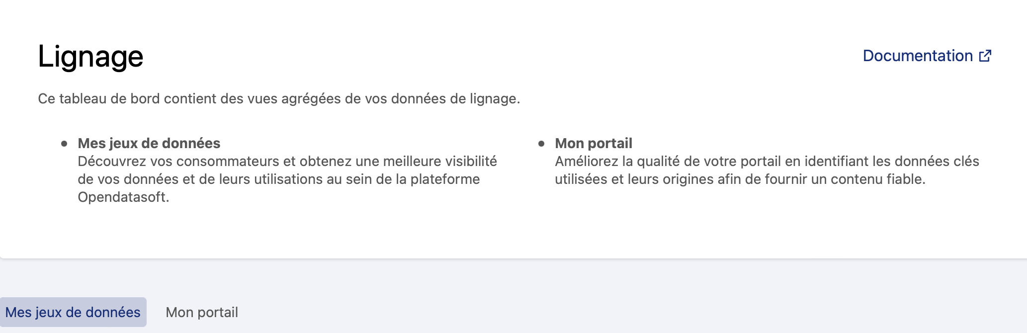 Pour basculer entre ces deux vues (jeux de données et portail), cliquez sur les onglets en haut.