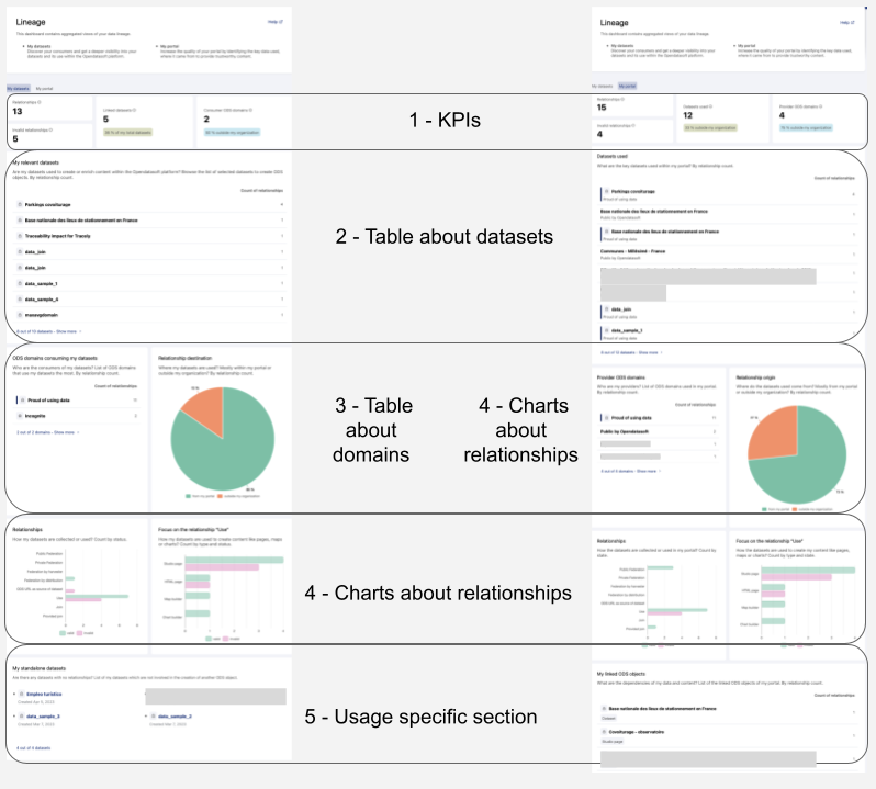 Il y a un chevauchement d'utilisation entre les deux onglets, car vous pouvez utiliser vos jeux de données pour créer votre propre contenu. Les deux onglets ont été conçus pour accéder rapidement à des informations sur deux problématiques distinctes :->L'impact de mes jeux de données au sein de la plateforme Huwise.->La gestion des dépendances de mes données et contenus sur mon portail.