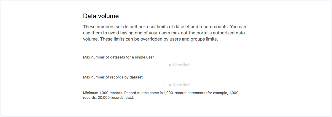 Lorsqu'un utilisateur fait une requête (qu'il s'agisse d'un appel d'API, d'une création de jeu de données ou de la publication d'un jeu de données), nous nous assurons qu'il n'atteint pas la limite par défaut qui lui est fixée et ne dépasse pas la limite globale du portail. Si c'était le cas, un message apparaîtrait pour le lui dire.
