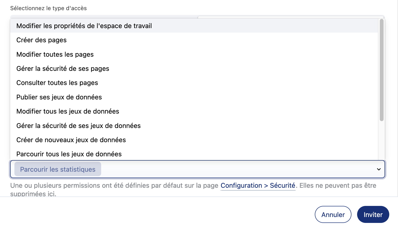 N'oubliez pas qu'il s'agit de permissions générales qui s'appliquent à l'ensemble de votre espace de travail, mais qu'un utilisateur peut également recevoir des permissions pour jeu de données individuels.