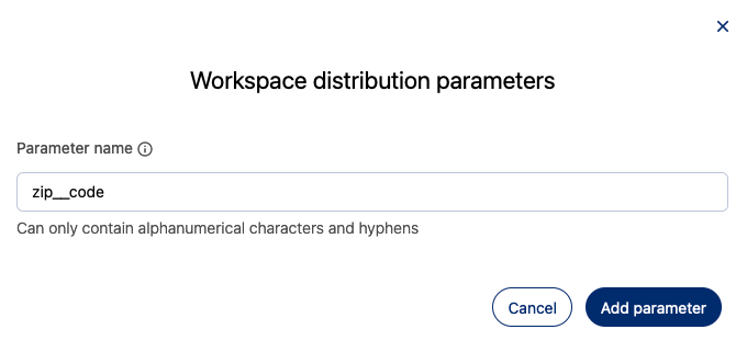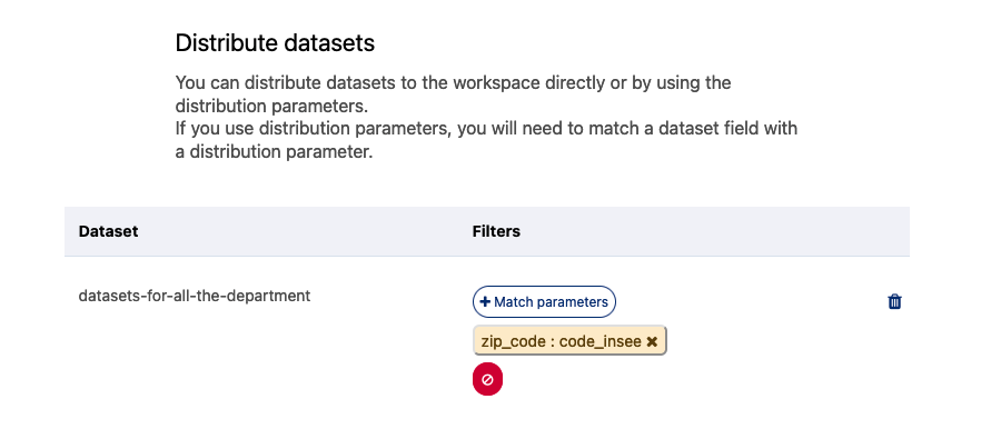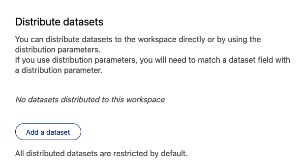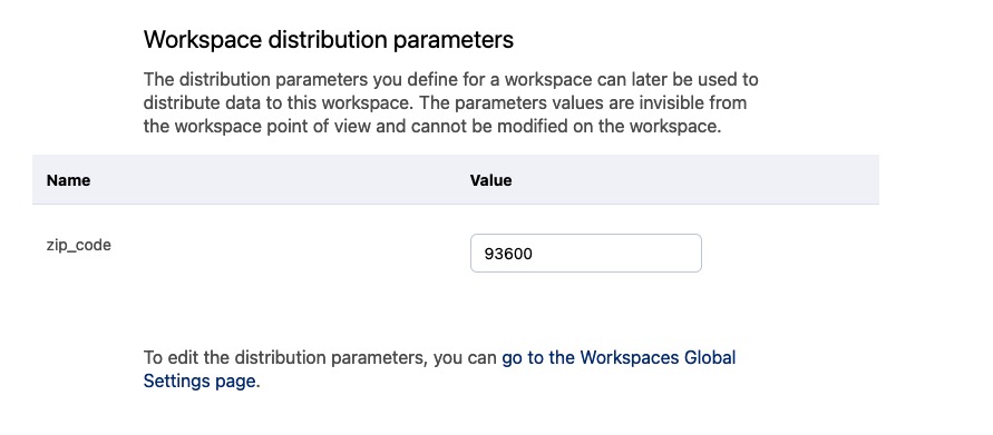 En tant qu'administrateur gérant vos espaces de travail, vous pouvez définir des "paramètres de distribution". Ces paramètres vous permettent de sélectionner uniquement les enregistrements d'un jeu de données distribué qui correspondent à la valeur des paramètres de distribution définis. Il est important de noter que ces paramètres peuvent être définis pour des espaces de travail secondaires individuels.