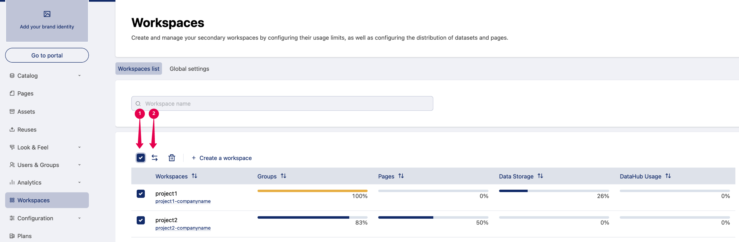 Pour distribuer des jeux de données ou des pages sur plusieurs espaces de travail, vous devez, depuis la liste des espaces de travail: