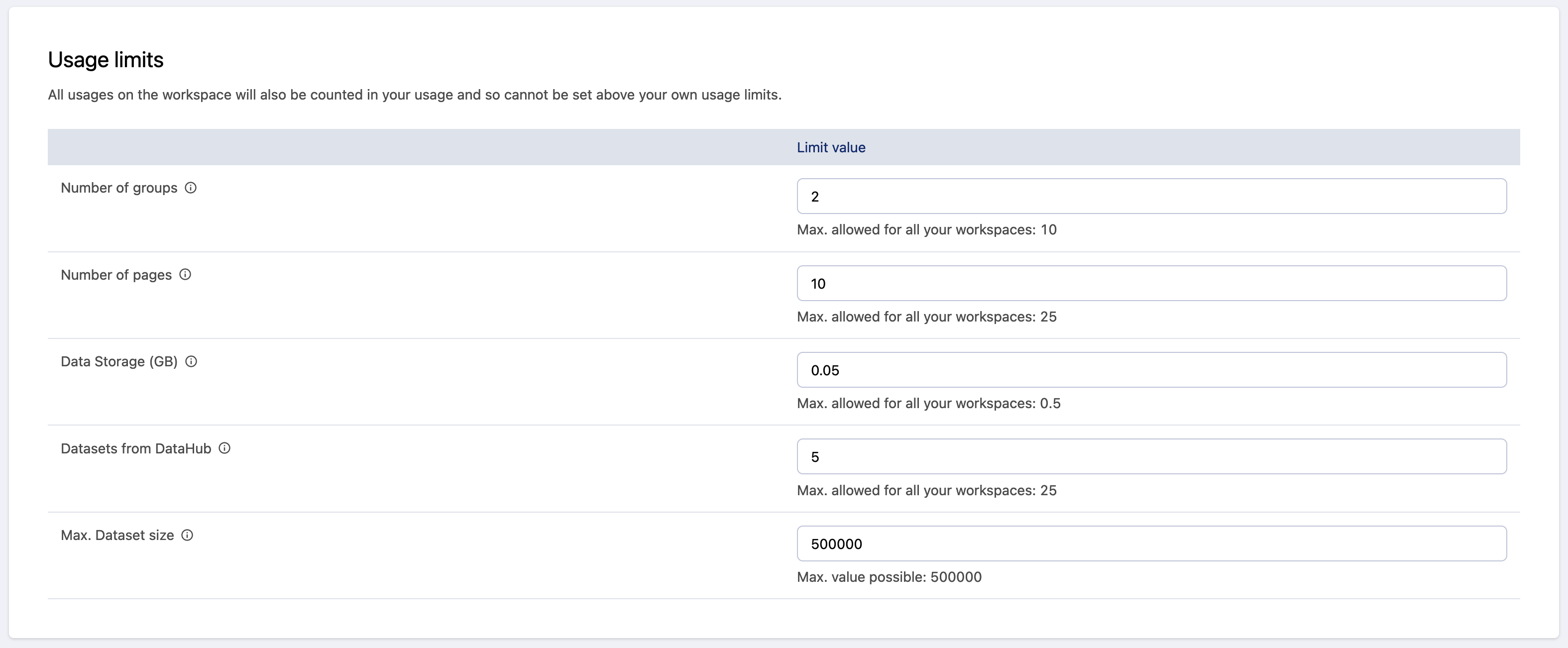 L'utilisation de vos espaces de travail secondaires (stockage de données, nombre de pages, etc.) est incluse dans les quotas de votre espace de travail principal. Pour éviter que l'un de vos espaces secondaires ne consomme trop, vous pouvez attribuer des limites individuelles à chaque espace de travail.