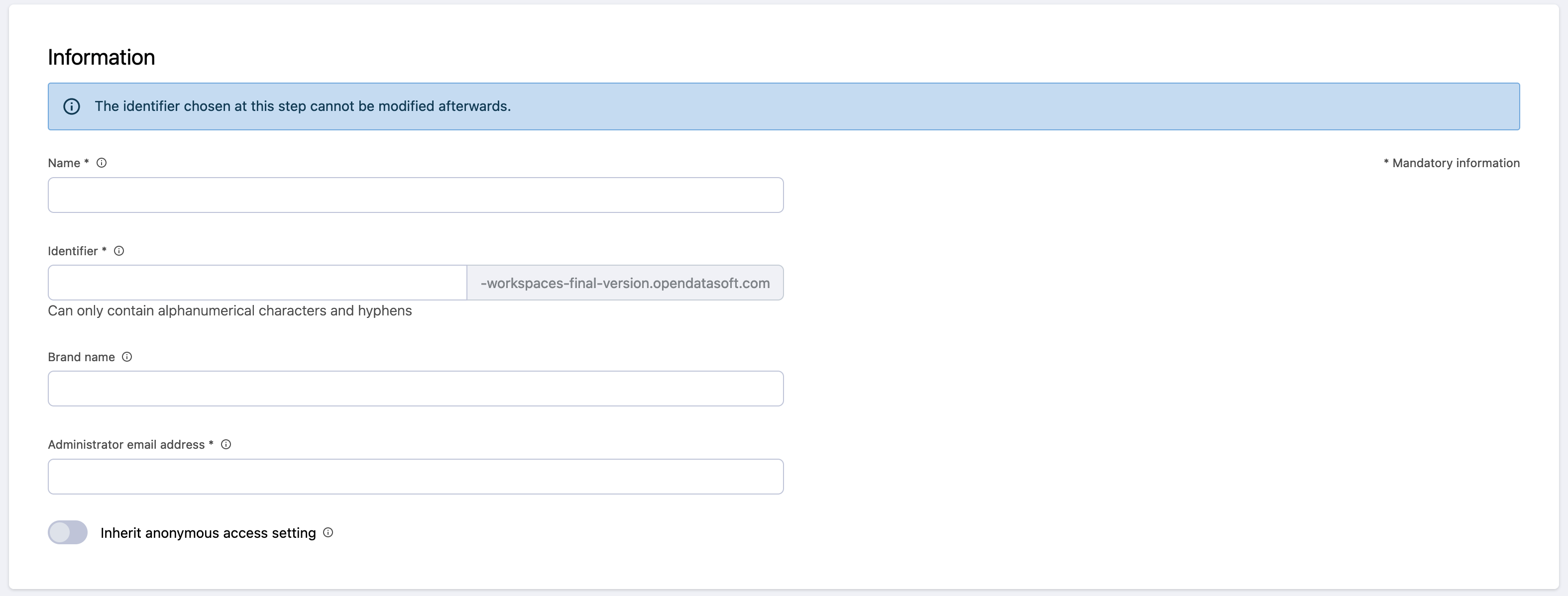 Nom : Le nom de l'espace qui apparaîtra, par exemple, dans les e-mails. Cela peut être modifié ultérieurement par n'importe quel administrateur d'espace de travail créé avec le menu de personnalisation.