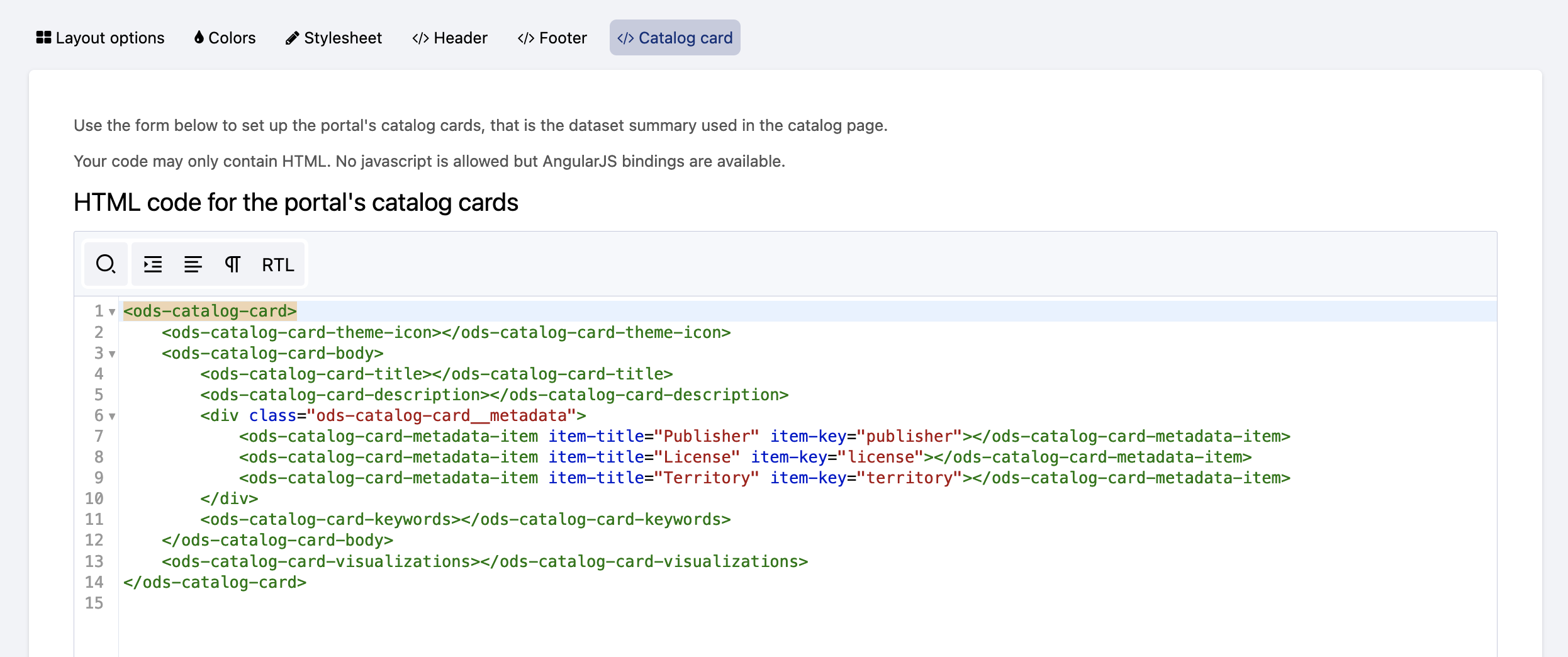 L'onglet Fiche catalogue affiche un éditeur dans lequel ajouter du HTML pur. Il permet de personnaliser les fiches catalogue affichées dans le catalogue du portail, et qui représentent les jeux de données publiés de ce portail (voir Exploration d'un jeu de données à partir du catalogue).