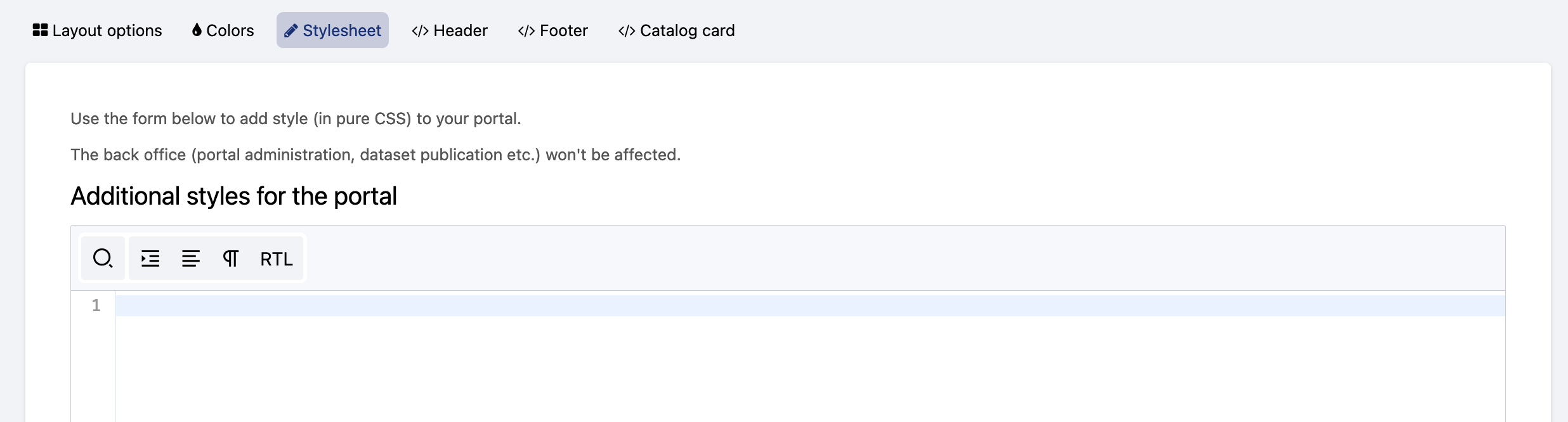 L'onglet Feuille de style affiche un éditeur dans lequel ajouter des règles de style CSS pures. Il permet de pousser encore plus loin la personnalisation d'un thème de portail.