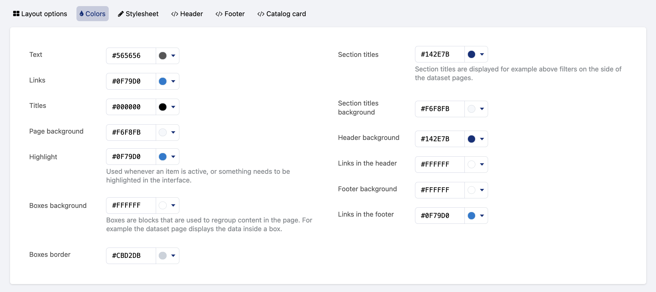 La couleur des éléments suivants d'un portail Huwise peut être configurée dans cet onglet :