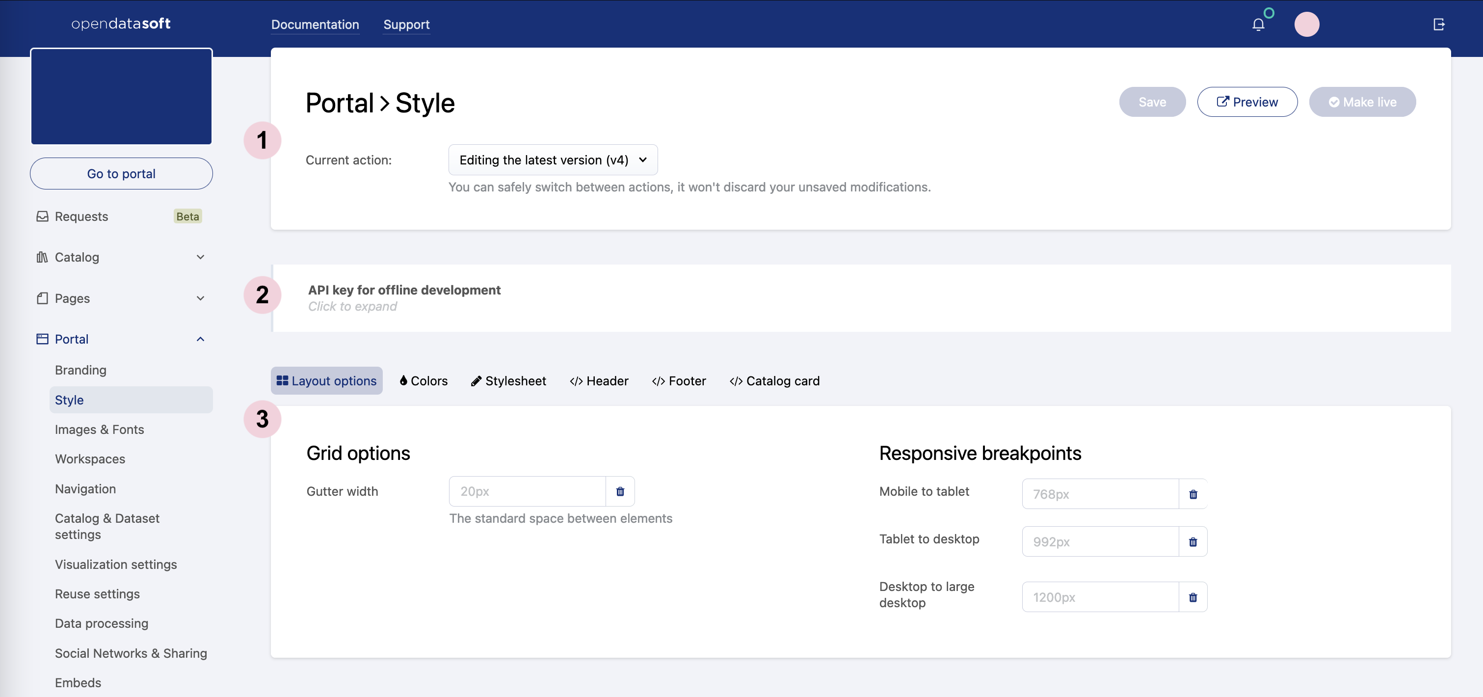 3. Make live, pour appliquer les configurations nouvellement appliquées et mettre à jour le thème en direct sur votre portailLa clé API pour le bloc de gestion du développement hors ligne, qui permet l'utilisation et la génération de nouvelles clés API.