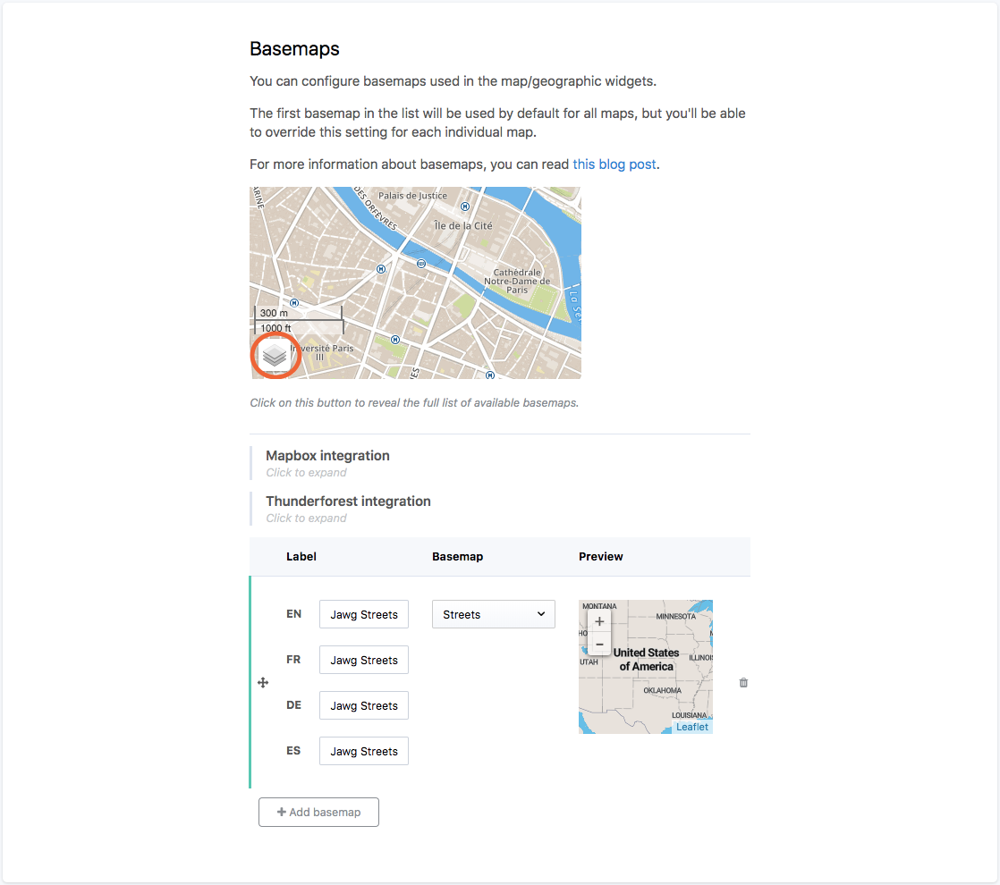 Label, pour donner un nom aux fonds de carte. Chaque fond de carte doit avoir un label par langue disponible sur l'espace de travail.
