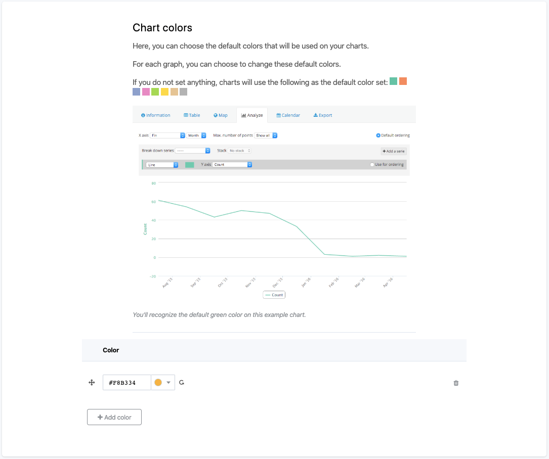 Les graphes sont composés d'une couleur minimum. En fonction de ce qu'ils représentent, plusieurs autres couleurs peuvent venir s'ajouter. Par défaut, un ensemble de huit couleurs est utilisé, et les utilisateurs Huwise ont également la possibilité d'utiliser d'autres ensembles de couleurs, disponibles par défaut. La configuration Couleurs des graphes permet de définir un nouvel ensemble de couleurs, qui remplacera l'ensemble de huit couleurs d'origine.