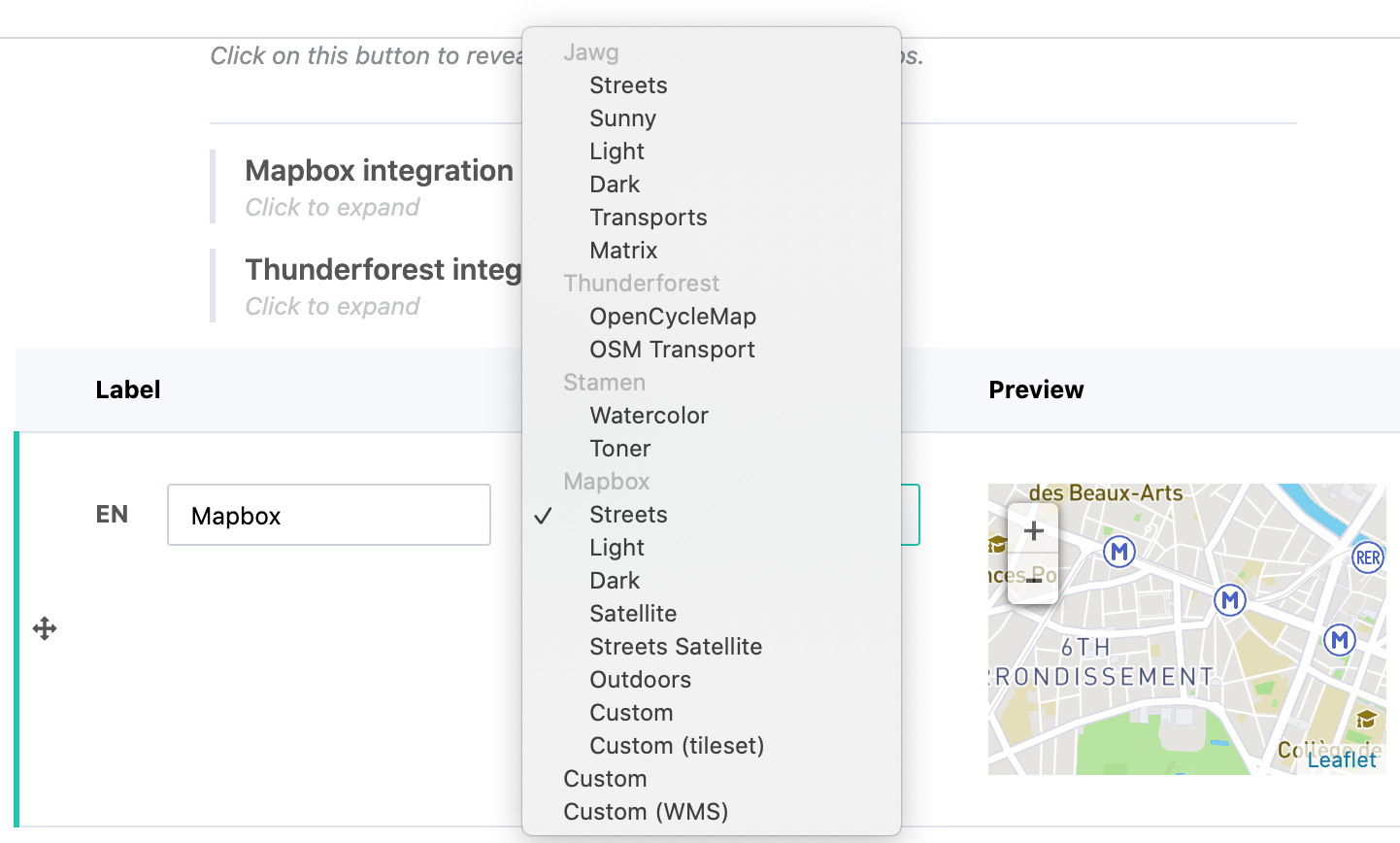 Dans la configuration Fonds de carte, cliquez sur "Intégration Mapbox" pour développer les configurations associées.