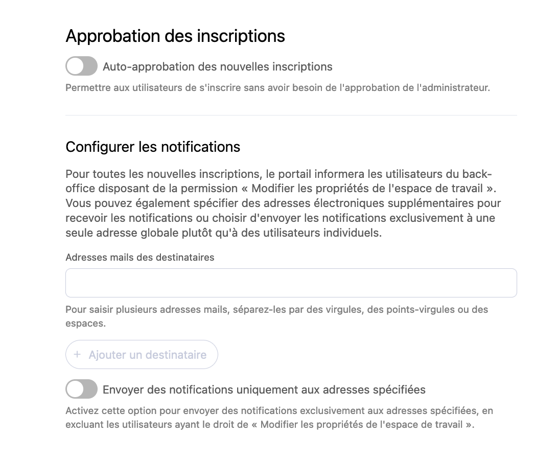 Si vous autorisez les inscriptions publiques, il vous faudra alors déterminer si vous souhaitez approuver manuellement ou non chaque demande d'accès à votre portail. Notez que, quelle que soit votre décision, chaque membre du portail autorisé à gérer les utilisateurs recevra une notification pour chaque nouvelle demande d'accès.