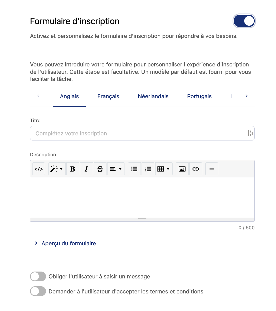 reCAPTCHA protège vos formulaires publics contre le spam et les abus en faisant la distinction entre les humains et les ordinateurs dans votre portail. Cette option est désactivée par défaut.