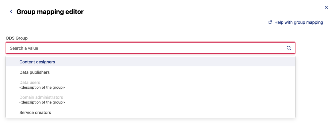 Si vous ajoutez des descriptions à vos groupes, vous pourrez les voir ici. Cela peut vous aider lors de la création de vos mappings. Notez que les groupes pour lesquels un mapping a déjà été effectué sont grisés et ne peuvent pas être sélectionnés. Pour les modifier, sélectionnez-les dans la liste de l’écran précédent.