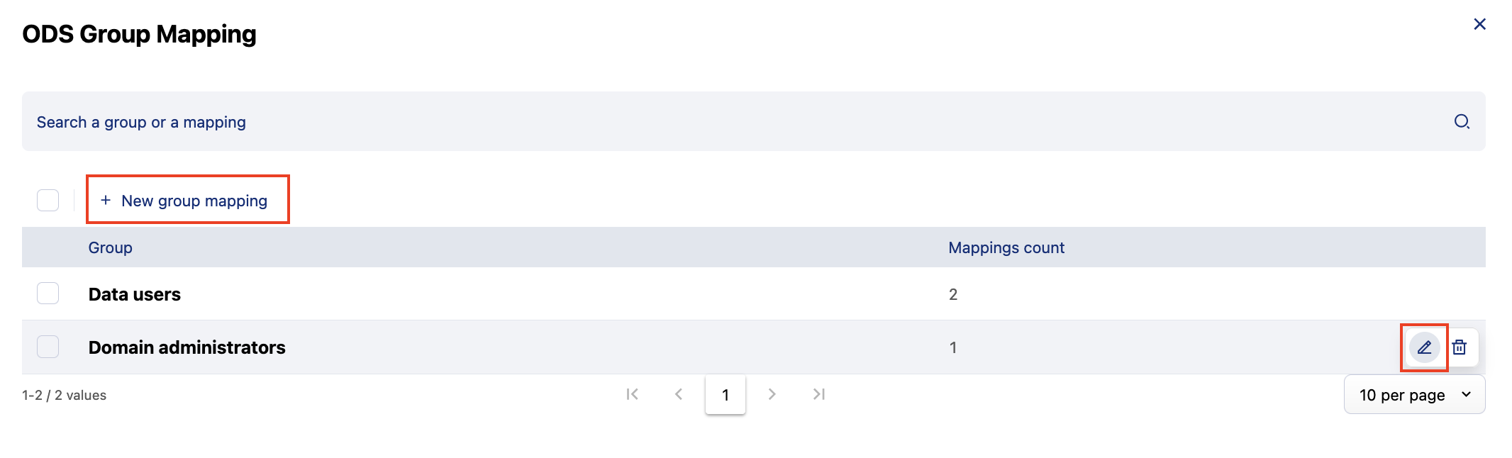 Cela ouvrira l'interface dans laquelle vous créerez et modifierez tous vos mappings. Pour créer un nouveau mapping, cliquez sur " + Nouveau mapping de groupe ". Pour modifier un mapping existant, survolez-le et cliquez sur l'icône en forme de crayon.
