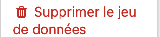 Supprimer le jeu de données | Retire le jeu de données des catalogues de l'interface de navigation et de l'interface d'administration. La suppression du jeu de données est totale : elle inclut ses enregistrements ainsi que tous les éléments en lien avec le jeu de données.