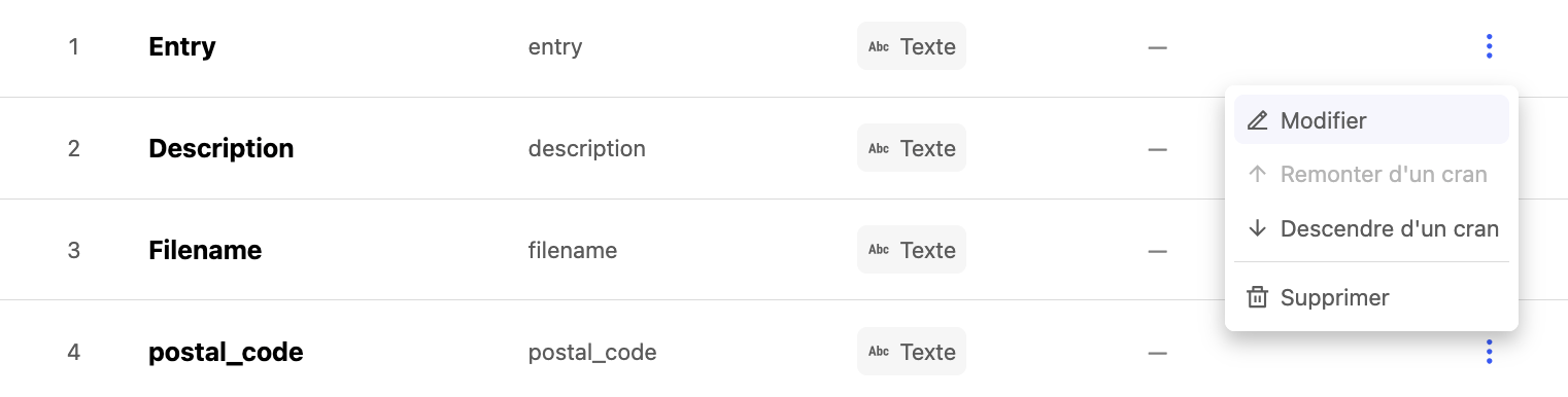 Vous pouvez également réorganiser les champs en les faisant glisser et en les déposant à l'aide de l'icône de six points située à gauche, ou en utilisant les flèches vers le haut et vers le bas.
