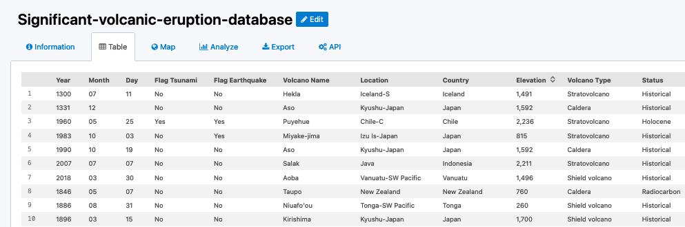 La vue la plus basique de vos données qu'un utilisateur peut avoir est la liste de vos jeux de données publiés. En fonction du type de données dans vos jeux de données, chacun aura un certain nombre d'onglets différents—par exemple, chaque jeu de données a la vue de base Table, mais seuls les jeux de données contenant des données géographiques afficheront l'onglet Carte.