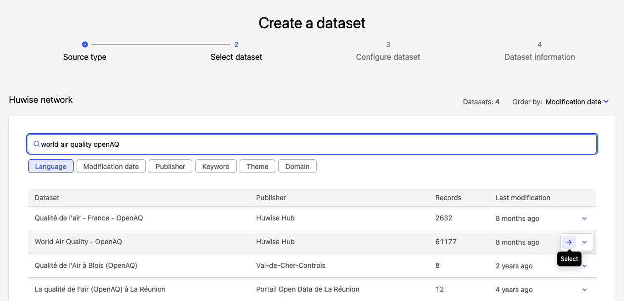 Sélectionnez le jeu de données dont vous avez besoin, en utilisant des filtres et des termes de recherche pour vous aider à le trouver.